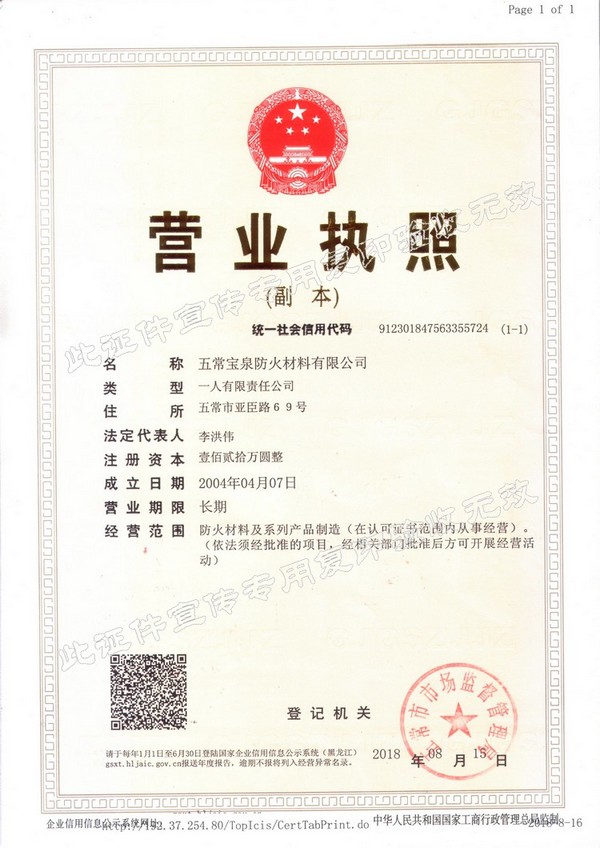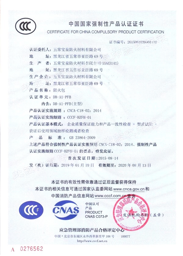 企業(yè)簡介 五常寶泉防火材料有限公司(黑龍江省寶泉消防設備有限公司)是主要制造、經營、銷售防火阻燃材料系列產品。其中以自粘性阻燃包帶(ZFBD)、阻火包(PFB)、有機防火堵料(SFD)、室內超薄型鋼結構防火涂料(NCB(BCF)-1)為主要產品。寶泉牌防火材料系列產品是普通防火材料的更新換代產品,防火性能優(yōu)異,具有普通防火材料沒有的諸多優(yōu)點:施工方便、經久耐用、耐火極限高、熱傳導率低、耐腐蝕、抗老化、無毒無害、環(huán)保、可以連續(xù)施工等特點。產品廣泛應用于電力企業(yè)(各型電廠、輸變電公司、電建公司、電力公司)、石油化工企業(yè)、冶金業(yè)、通訊業(yè)、地鐵、隧道、...